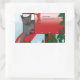 Gato gris que se escondía en un buzón rojo esperando al cartero.