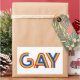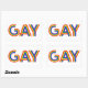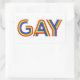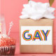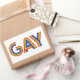 Esta obra de arte muestra la palabra gay en una colorida fuente arcoiris.