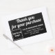 Gracias por su compra, un mensaje para apreciar la compra de su cliente. pegatina de personalizable que puede poner su nombre de negocio y con el mensaje Gracias por su compra. Los diseños son textos blancos sobre fondo negro y forma rectangular. Para personalizar de este pegatina, cargue el logotipo de su empresa, escriba el nombre de su empresa o empresa, la dirección y el número de teléfono. Después de subir el logotipo y escribir textos, por favor compruebe la apariencia. Si la apariencia le resulta agradable, puede realizar su pedido ahora. Si necesita cambiar el tamaño y mover el logotipo y los textos para que encajen en este pegatina, cambie la herramienta de diseño. También puede realizar otros cambios según la apariencia que prefiera en la herramienta de diseño, como cambiar el color de fondo, el color de la fuente y el estilo de fuente. Pegatina para valorar la compra de su cliente. Pegatina que también puede usar como material de marketing para promocionar su negocio y promocionar su marca o crear conciencia de marca.