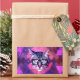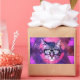 Esta es una impresión abstracta genial con un gato hipster. Colores o púrpura y rosa con motivos geométricos, "estrellas" y la atracción principal, un gato con gafas encaladas negras.