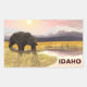 Una pintura digital de un oso pardo acercándose a un estanque mientras el sol desciende sobre montañas lejanas. También está presente el texto que dice "IDAHO".