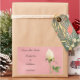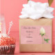 Un personalizado Guardar el pegatina de fecha con letras de guión y un elegante rosebud blanco. Un elegante acercamiento de un antiguo cuadro botánico.