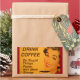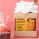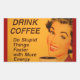 Mujer sonriente con lápiz labial rojo retro y uñas bebe su taza de café matutino. La leyenda dice "Beba café - Haz las cosas estúpidas más rápido con más energía".