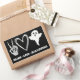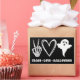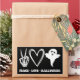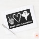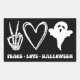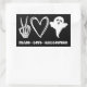 Peace Love Halloween pegatina en letras retro con mano esquelética, corazón y fantasma espeluznante.
