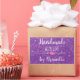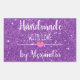 Moderno pegatina rectangular "hecho a mano con amor" con un tipo de letra blanca sobre un fondo purpurina morado adornado por un corazón adorable. Texto personalizado.