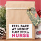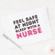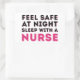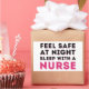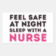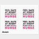 Siéntete a salvo de noche, duerme con una enfermera Una enfermera linda, fresca y divertida que dice una cita en un texto rosado y negro.