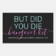 Kit de supervivencia y recuperación de resaca personalizado "¿Pero moriste?" con pegatina rectangular en negro, teal neón brillante y rosa caliente y texto personalizado con la ubicación de la celebración y la fecha. Simplemente agrégalo a tus kits de alivio de resaca DIY para tu despedida de soltera, viaje de chicas, cumpleaños, fiesta de graduación o regalos para la fiesta de boda.