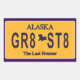 Esta imagen de una placa de licencia dice ALASKA GR8 ST8, y EL ÚLTIMO FRONTERA. El texto púrpura se coloca sobre un fondo dorado. ¡Muestra tu orgullo por el gran estado de Alaska! *La imagen prediseñada utilizada en este diseño está protegida por derechos de autor por Encore Software, Inc., que permite su uso a sus licenciantes. Todos Los Derechos Reservados.