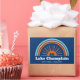 En los meses más fríos, los amantes de las aventuras pueden visitar el área del lago Champlain para pasear, hacer caminatas, pescar y escalar, y practicar esquí de fondo, raquetas de nieve y ciclismo de neumáticos gratos. Este diseño retro tiene un arcoiris y una canoa.
