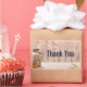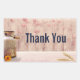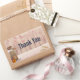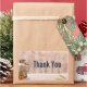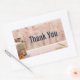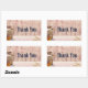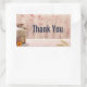 Gracias pegatinas con un diseño rústico de campo. Una vieja lata de leche oxidada con una flor naranja bonito. El trigo y las amapolas rojas descoloridas se colocan en el fondo contra un panel de madera tenue.