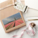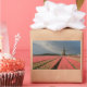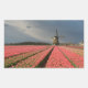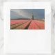 Pegatina fotográfico rectangular de un paisaje con un molino de viento y flores de tulipán rosadas en filas en una granja de bombillas bajo un cielo gris en el campo en los Países Bajos en primavera.