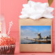Pegatina fotográfico rectangular con un molino de viento al lado de un pequeño río a la luz del sol de una fría mañana de invierno en un paisaje campestre holandés con nieve en los Países Bajos.