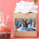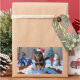 Un ilustracion vacacional reconfortante con un perro alegre jugando en la nieve, usando un sombrero de Santa y rodeado de coloridas cajas de regalos. En el fondo, los niños construyen un muñeco de nieve al lado de un árbol de Navidad cubierto de nieve, creando un alegre maravilloso país invernal. Perfecto para difundir alegría por las vacaciones y capturar la magia de los Navidades.