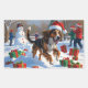 Un ilustracion vacacional reconfortante con un perro alegre jugando en la nieve, usando un sombrero de Santa y rodeado de coloridas cajas de regalos. En el fondo, los niños construyen un muñeco de nieve al lado de un árbol de Navidad cubierto de nieve, creando un alegre maravilloso país invernal. Perfecto para difundir alegría por las vacaciones y capturar la magia de los Navidades.
