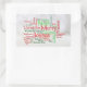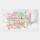 Una colorida nube roja y verde de palabras de Feliz Navidad en muchos idiomas del mundo sobre un fondo de decoración de vacaciones blancas, ramas de árboles y nieve, hace que una alegre expresión de bienvenida para todos. Mejores Navidades de las nuevas a tu y a la tuya.