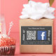 Un fondo gris de carbón vegetal. Personalice y agregue su nombre de negocio, su propio código qr a su cuenta de Facebook y un texto. Texto blanco. Con el texto x2: ¡Síguenos!