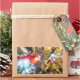 Un cuadro digital de adornos y luces de vacaciones en un pino.