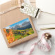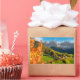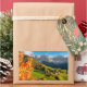 Pegatina fotográfico rectangular de una iglesia y del pueblo de St. Magdalena en Villnoess en un paisaje de cuento de hadas con majestuosas montañas Dolomitas en el fondo y hojas en colores otoñales en el valle Val di Funes en Italia.