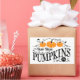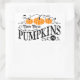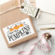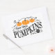 Este adorable pegatina de una casa de campo tiene un cartel con un parche de calabaza que dice "Calabazas frescas de granja" con una fuente decorativa.
