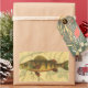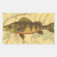 Esta impresión ilustra una imagen artística de un pez perca amarillo. El fondo muestra un mapa geográfico vintage en tonos beige claro. El marco marrón se asemeja al antiguo patrón de madera con flores amarillas-rojas en los bordes. ¡Una gran adición a tu colección de pesca!