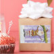 Ilustracion Vintage lindo Diseño navideño Feliz Navidad con un adorable, feliz, alegre Santa Claus usando un gorra de patrón de diamante y parado en la nieve del invierno. Está sosteniendo una pancarta que dice "Creer" con un fondo morado con remolinos y estrellas que parecen copos de nieve. ¡Saludos de temporada!