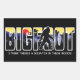 ¿Me has visto? La gente de todo el mundo tiene una historia de pies a cabeza que contar. Hay tantos espectáculos sobre los pies en la cama. Él también usa muchos nombres. Pie grande, Sasquatch, yeti (sólo alto en las montañas) rapé, yowie, el hombre de la hierba, por nombrar algunos. Este diseño pegatina pone un gran pie en el bosque en la palabra BIGFOOT. El sol se pone y una gran bola roja brillante en un cielo amarillo. Los árboles oscuros y las montañas azules son el telón de fondo. La silueta del pie grande en su famosa posición de caminar delante y delineado en blanco.