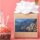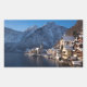 Pegatina fotográfico rectangular de la ciudad de Hallstatt cubierta de nieve en la orilla del lago de Hallstätter Ver lago con montañas de los Alpes al fondo a la primera luz del amanecer en un paisaje invernal en Austria.