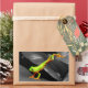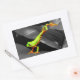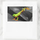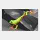 Rana acrobática de árbol verde cal con rayas naranjas y negras en el vientre, parece que está haciendo un caballete. Anfibio saltante muy colorido sobre fondo blanco y negro.