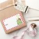 Navidades divertidos etiquetan tus regalos. Una feliz rana verde con un sombrero de Papá Noel rojo y blanco y rodeada de brillantes estrellas amarillas está sentada en el lado derecho. A la izquierda hay espacios para añadir la información a y desde y un borde de rayas diagonales rojas y blancas.