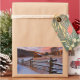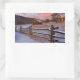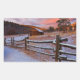 Esta foto muestra un granero rústico cubierto de nieve frente a una hermosa puesta de sol en un rancho de Colorado.