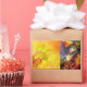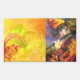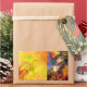 Colorido, caprichoso y vibrante pintura acuarela de colores vivos rojo, marrón, amarillo, naranja, verde con Relieve metalizado dorado y plateado.
