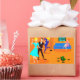 ¡Estos Pegatinas retro Personalizados Fiestas de cócteles no tienen un hueso introvertido en sus cuerpos! El diseño moderno de mediados de siglo incluye un vibrante dibujo personalizado de una sala de estar y un animado fiesta de cócteles. Hay una pareja atractiva en la pista de baile. La mujer rubia con un vestido turquesa y su alta, oscura y guapa escolta están bailando la cha-cha. En el suelo hay un récord verde rodeado de discos de vinilo. Contra la pared del fondo, un bonito pelirrojo está sentado sobre un sofá azul. Ella lleva un vestido rosa brillante. Su único accesorio es el vaso martini en su mano. A su lado hay una lámpara de suelo sin la sombra. Hmm... ¿Dónde está la sombra? Está en la cabeza de un hombre mareado con un traje azul que claramente es la vida del fiesta. También está sosteniendo un vaso de martini. El que decoró la habitación no tenía miedo del color. Tiene una pared de ladrillo naranja y un suelo naranja. En la pared que hay detrás del sofá, hay un cuadro verde azulado y turquesa de un globo con un marco negro. ¡Hacen sellos para sobres divertidos para sus invitaciones a fiestas!