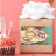 En esta encantadora representación de una huella devocional, el Rosa de Lima (1586-1617) se alza en un paisaje tropical peruano al caer la noche. Pequeñas estrellas amarillas brillan en el oscuro cielo azul-verde detrás de ella. Está flanqueada a la izquierda por una iglesia de tablón de madera marrón y a la derecha por una palmera que se balanceaba. Vestida con el hábito dominicano de color crema que se adapta a su pertenencia al Tercer Orden, lleva una corona de espinas en memoria de la pasión de Cristo sobre su velo blanco. Ella sostiene una armadura de rosas rosas rosas y una cruz de madera. + St. Rosa fue la primera persona nacida en las Américas en ser declarada santa y sigue siendo popular. Es la patrocinadora principal del Perú y de los pueblos indígenas de América Latina, copatrocinadora de Filipinas con San Pudentiana, patrocinadora de las Américas en general, y patrocinadora de Santa Rosa, California, y su Diócesis. Además, es la santa patrona de bordadores, jardineros y floristas. Naturalmente, rosas de todas las variedades se han convertido en su atributo. En el arte, la representan coronada de rosas, sosteniendo rosas (como aquí), o en un ambiente con rosas en macetas o arbustos rosas floridos. + Festín: 23 de agosto + Crédito de la imagen (M 024): Imagen antigua de San Rosa de Lima de un cromolitograma devocional impreso en Alemania, editorial original desconocido a finales del siglo XIX y principios del siglo XX, de la colección privada de ephemera religiosa del diseñador.