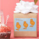 Una postal antigua y vintage de la Pascua feliz con tres chicas de fieltro amarillas borrosas todas seguidas. Antecedentes en azul. ¡Feliz Pascua!
