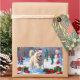 Un alegre Samoyed corre juguetonamente a través del paisaje invernal nevado, luciendo un festivo sombrero rojo de Navidad. Este encantador diseño resalta el pelaje blanco esponjoso de la raza, su expresión sonriente y personalidad amigable, mientras captura el calor y la magia de la temporada navideña. Un momento invernal conmovedor lleno de alegría festiva.