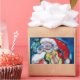 Colorido, caprichoso y artístico cuadro de acrílico, Santa está tocando violín en la nevada noche de invierno, búho, ornamentos florales, plantas de invierno, bayas huecas de colores vivos rojos, verdes, blancos, azules, amarillos.