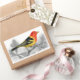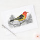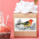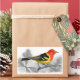Dibujo vintage de un ave de Tanager Occidental con la cabeza roja y el pecho amarillo sobre un fondo gris. Este dibujo de colores del Western Tanager proviene de la antigua serie de tarjetas publicitarias Arm and Hammer Baking Soda.
