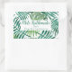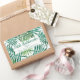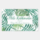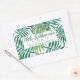 Las hojas verdes tropicales bordean el saludo a Mele Kalikimaka, hawaiano para Feliz Navidad. De Su apellido se imprime debajo del saludo de vacaciones. El texto se imprime con dos fuentes coordinadoras en verde festivo.
