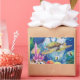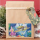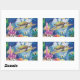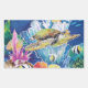 Pintura de seda de una tortuga marina verde y amigos. Pequeños peces de oro, peces ángeles y otros comparten el mar con algas y corales coloridos. Divertido y luminoso para acuarios, tiendas de regalos, regalos y tarjetas.