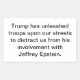 Trump has unleashed troops upon our streets to distract us from his involvement with Jeffrey Epstein. Conscious-Social-Commentary Splash-art sticker-design by Jeff Hankamer at Artjunkhaus