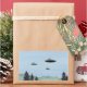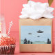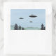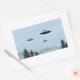 Una acuarela, pluma y tinta, y un dibujo a lápiz de color de tres OVNIs de platillo sobre las montañas.
