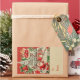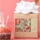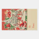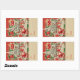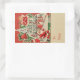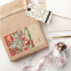 This is a charming, vintage-style Christmas sticker that features a classic holiday scene with a bright red and green color palette, including a glitter texture around the edges and on the snow. The main image shows Santa Claus kneeling in the snow in front of a red house covered in snow, with a frosted Christmas tree and a festive banner reading "MERRY CHRISTMAS". Above the scene, there is a red bell with a green bow and two sweet angel girls holding a red ornament. The bottom section is a plain tan color with designated spots for "To:" and "From:", and the tag has a blue and white string attached for tying onto a present.