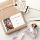 Ein freundliches kleines Mädchen mit einem kleinen Geschenk in der Hand bestellt viele Grüße zum Fest.