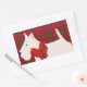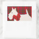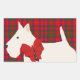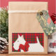Large white space for writing a name. Stylized Scottish terrier dog with kerchief and large red bow. Plaid background with Christmas colors of red and green.