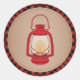 Un pegatina con un ilustracion de una linterna de camping roja sobre un fondo inspirado en el material de una tarjeta con un borde de manto rojo y negro. Busque invitaciones coincidentes en Jill's Paperie.