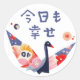 日本の伝統的なアイコンである折り鶴のモチーフを使用した幸せのステッカーです。鶴の羽には気持ちが明るくなる和紙の模様が描かれていて、カラフルで元気が出ます。メッセージには日本語で「今日も幸せ」と書いてあります。いつも目に入るところにぜひ忍ばせてください。
