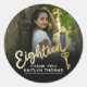 Eighteen bold gold style effect script text on black thank you favor sticker. Personalize this 18th birthday party favor sticker with a photo of your birthday girl or boy, name and message of thanks (currently reads Thank you). Ideal for personalizing your party favor gifts. Other years and matching items are available. © Original design by Sarah Trett for www.mylittleeden.com on Zazzle.