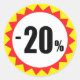 20 por ciento descuento o venta pegatinas en rojo, amarillo y blanco con texto negro "-20%". Estos pegatinas de venta al por menor son excelentes para etiquetar tu mercadería en un 20% de descuento.