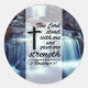 El pegatina de las escrituras inspiradoras cristianas ilustra una fotografía de la naturaleza de una hermosa cascada. Presenta una cruz y una porción de una motivadora Biblia Verse 2 Timothy 4:17, "El Señor se paró conmigo y me dio fuerza".