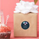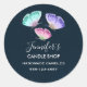 Pegatinas de negocios con un diseño de bonito. 3 mariposas acuarelas, rosas, violetas y verdes. Fondo de color azul oscuro.